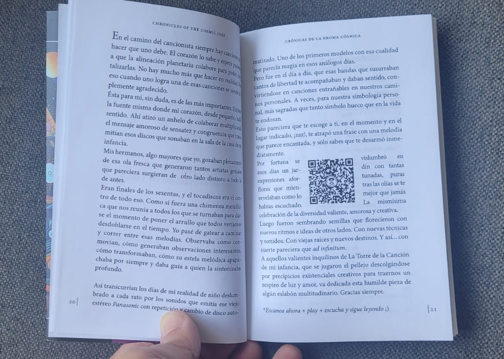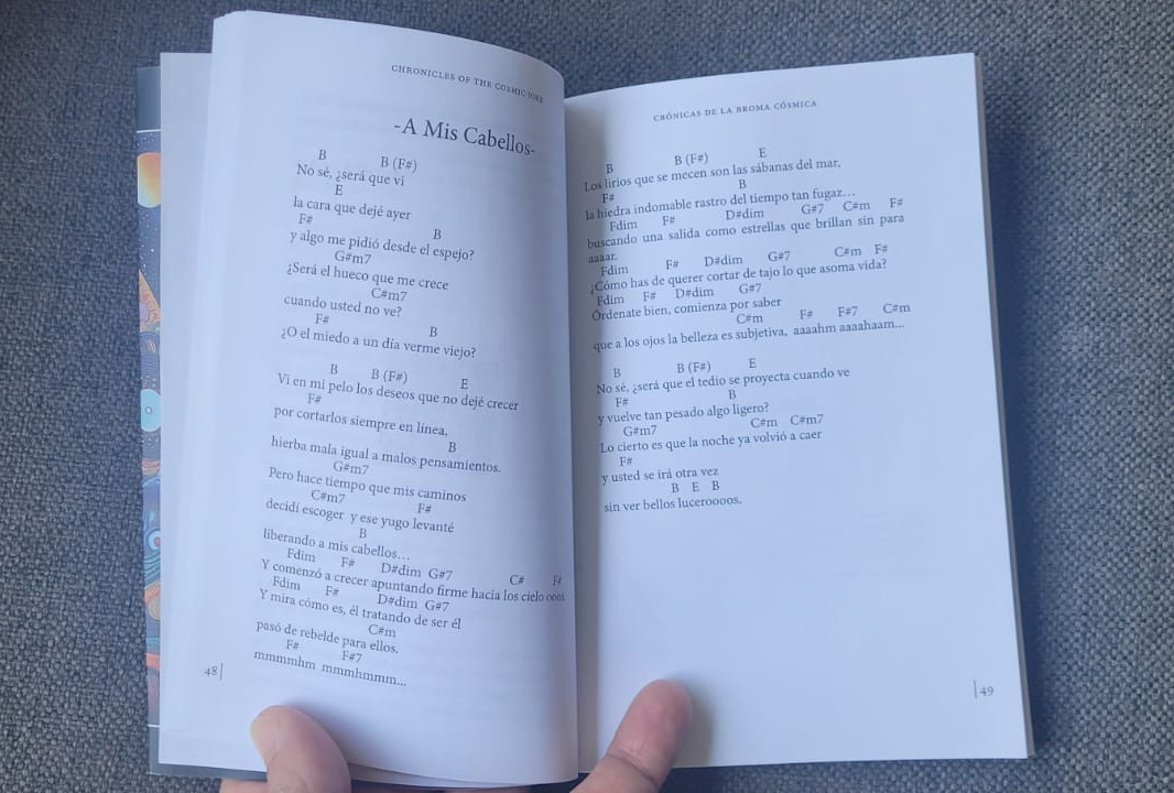 Una de las características de «Crónicas de la broma cósmica» es que incluye acordes para que los seguidores puedan tocar las canciones. Además, el libro se complementa con una novela gráfica que se puede leer mientras se escucha la música. «La idea es que el lector se encuentre con un código QR en el libro que lo lleve a la canción correspondiente. Así, la letra de la canción guía la lectura del cómic», explica Ades, quien busca crear una experiencia inmersiva que combine diferentes formas de arte.