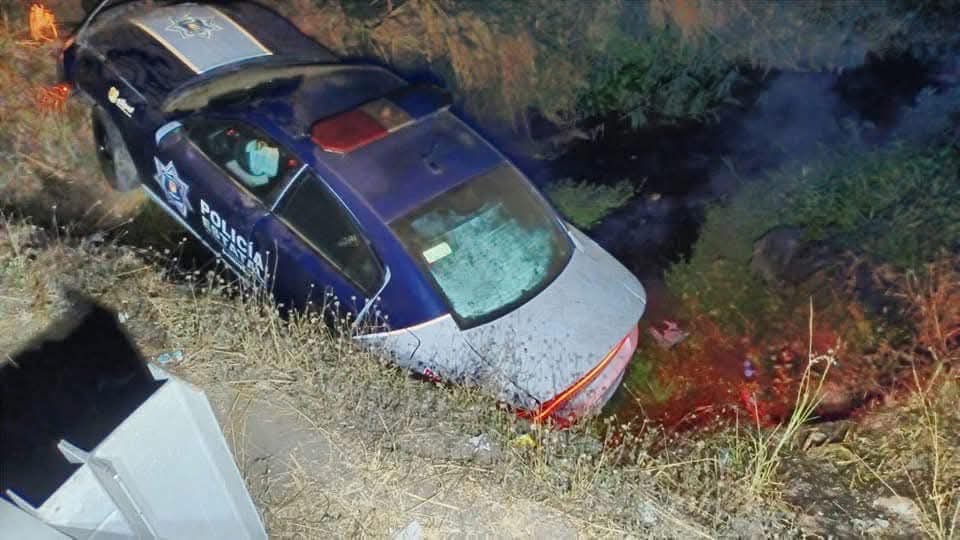 Durante el operativo, una patrulla intentó rebasar al tráiler, pero este le cerró el paso, provocando que la unidad cayera a un arroyo de tres metros de profundidad.