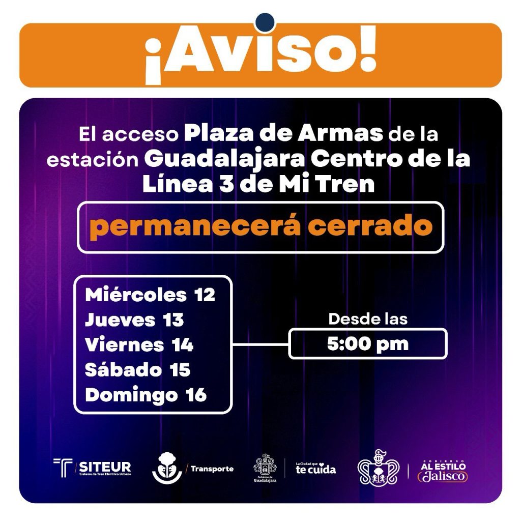 Adicionalmente, se implementarán cierres y modificaciones en el acceso a estaciones. Desde las 17:00 horas, el ingreso a la estación Guadalajara Centro de la Línea 3 por Plaza de Armas permanecerá cerrado, por lo que los usuarios deberán utilizar los accesos alternos en avenida 16 de Septiembre o la conexión con la Línea 2.