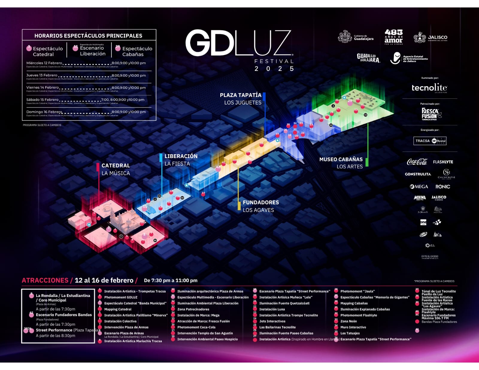 GDLuz tendrá un recorrido de 2 km con más de 35 atracciones. Las zonas se dividirán de la siguiente manera: