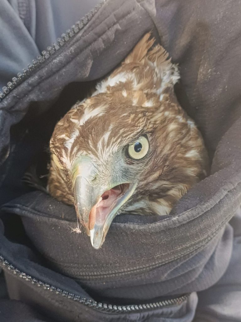 Un ejemplar de aguililla cola roja juvenil recibió tratamiento de curaciones preliminares por Especialistas de la Unidad de Rescate y Fauna Silvestre (URFST), tras su localización en mal estado de salud a orillas de la carretera a El Zapote del Valle, municipio de Tlajomulco de Zúñiga.