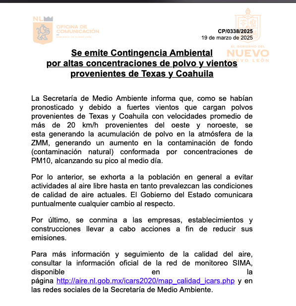El descenso en la calidad de las condiciones climáticas, las cuales se vieron afectadas por el flujo de aire contaminante originario del desierto de Coahuila y el sur de Texas, han sometido a la población regiomontana a más de diez días de incendios y la activación de una contingencia atmosférica, en previsión de posibles enfermedades producto de alergias o molestias por la aspiración de polvo, indicó Armandina Valdés Cavazos, titular de la Agencia de la Calidad del Aire en el estado de Nuevo León.