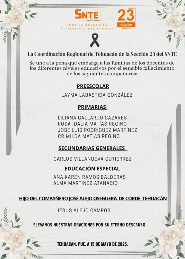 De acuerdo con el sindicato, entre las personas que fallecieron se encuentra la maestra de preescolar, Layma Labastida González; los maestros de primaria Liliana Gallardo Cazares, Rosa Idalia Matías Regino, Crimilda Matías Regino y José Luis Rodríguez Martínez.
