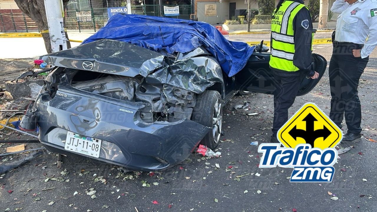 Un siniestro de automóvil con saldo fatal se registró la mañana de hoy en la bifurcación de las avenidas Mariano Otero y López Mateos Sur, en sentido norte a sur, lugar donde el conductor de un Mazda X5 pasó entre dos postes y se impactó contra un puesto de flores.