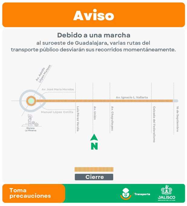Debido a una marcha programada en la Zona Metropolitana de Guadalajara (ZMG), la Secretaría de Transporte del estado ha informado sobre cierres temporales en una de las principales avenidas de la ciudad y cambios momentáneos en varias rutas del transporte público.