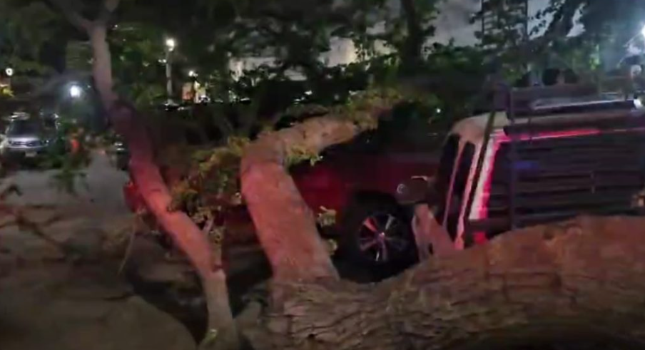 Cerca de las 9 de la noche de este jueves, las autoridades recibieron el reporte de una rama sobre dos coches. Vehículos de rescate y policías municipales localizaron la pieza del árbol sobre una pick up y un compacto.
