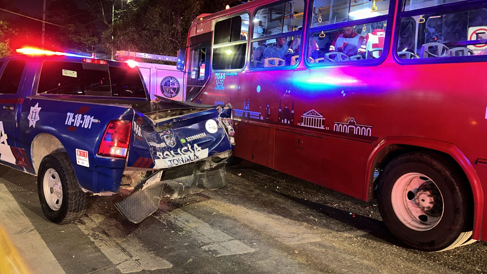 Una unidad de transporte público impactó por la parte trasera a una patrulla de la policía de Tonalá sobre el cruce de Héroes Ferrocarrileros y la avenida R. Michel, en la colonia La Aurora de Guadalajara.