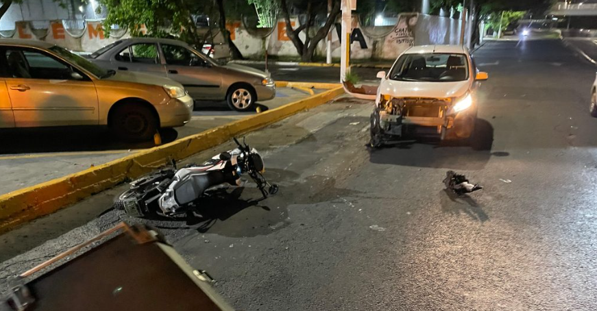 Un Nissan March y una motocicleta fueron protagonistas de un fuerte choque. El conductor del vehículo de dos ruedas presentó una fractura en una pierna y raspones. El accidente ocurrió en la confluencia de la calle Pedro Alarcón con la avenida Vallarta, en la colonia Jardines Vallarta de Zapopan.