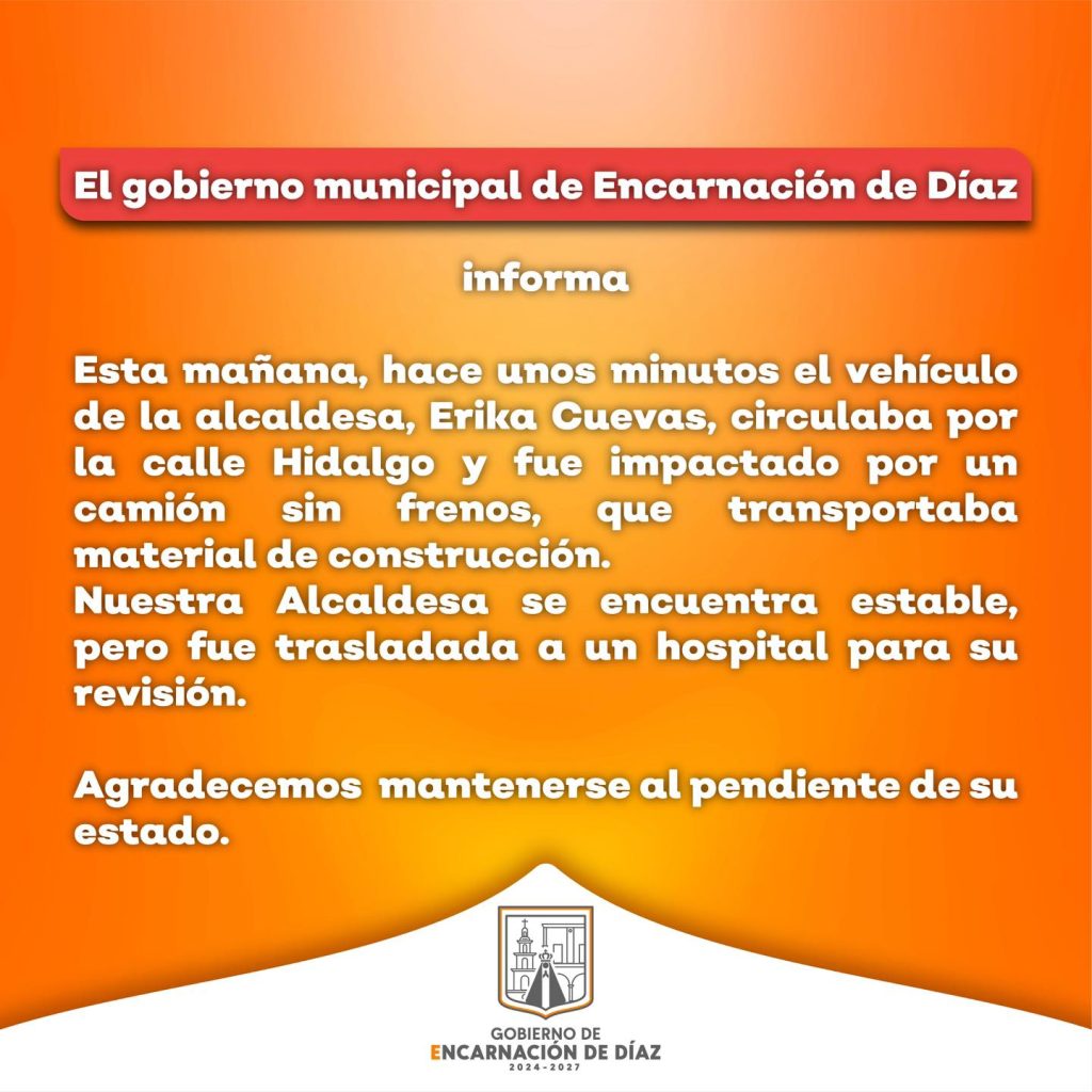 De acuerdo con un comunicado oficial emitido por el Gobierno Municipal de Encarnación de Díaz, la presidenta municipal circulaba por la calle Hidalgo cuando fue impactada por un camión sin frenos que transportaba materiales de construcción.