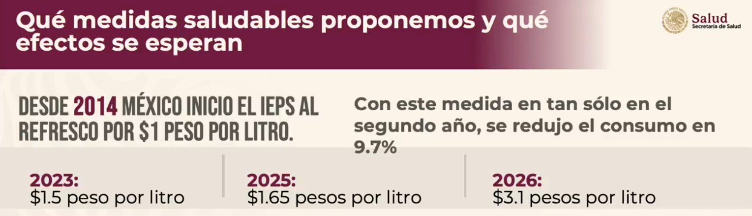 Clark recordó que en 2014 se implementó un impuesto de un peso por litro de refresco, lo que en su primer año generó una caída del 5.5 por ciento en el consumo, con una tendencia de reducción sostenida en los años siguientes. Ahora, dijo, el Impuesto Especial sobre Producción y Servicios (IEPS) se ajustará para quedar ligeramente arriba de tres pesos por litro, lo que elevará el precio promedio de la presentación de 600 mililitros en aproximadamente un peso.