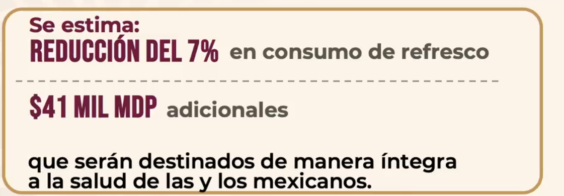 El gobierno estima que con el nuevo ajuste al impuesto se logrará una reducción de alrededor del 7 por ciento en el consumo de refresco en los próximos dos años y una recaudación de hasta 41 mil millones de pesos, que se destinarán a fortalecer el sector salud y atender a pacientes que ya padecen enfermedades derivadas del consumo excesivo de azúcar.