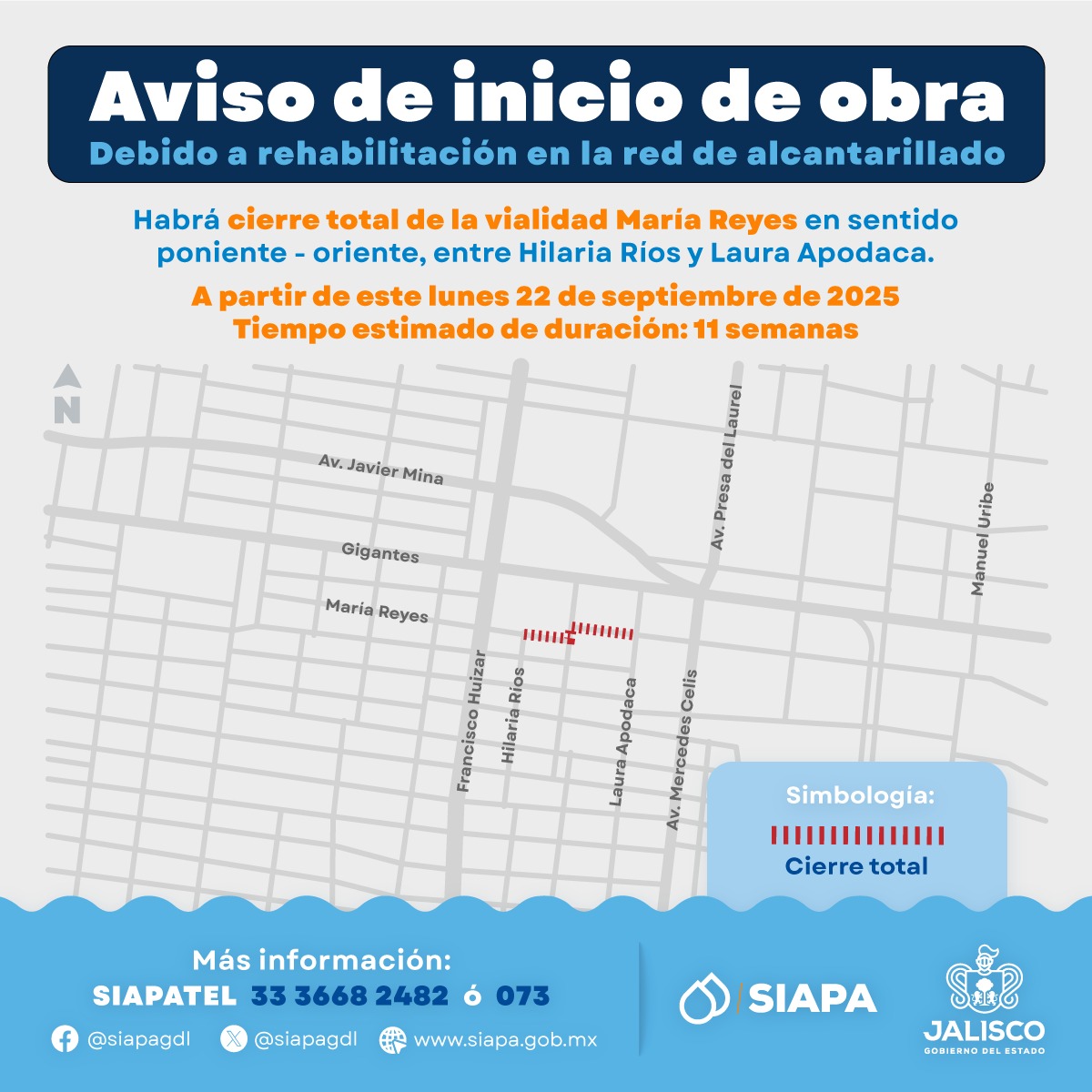 A partir del lunes 22 de septiembre, el Sistema Intermunicipal de los Servicios de Agua Potable y Alcantarillado (SIAPA) iniciará trabajos de renovación de infraestructura hidrosanitaria en distintos puntos de Guadalajara, con el objetivo de prolongar la vida útil de las redes de agua potable y alcantarillado.
