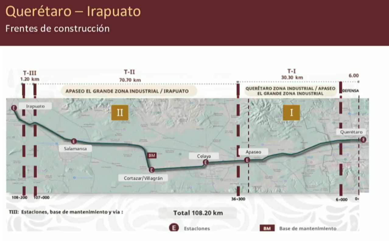 Las estaciones contempladas en el tramo son: Querétaro, Apaseo El Grande, Celaya, Cortazar, Salamanca e Irapuato.