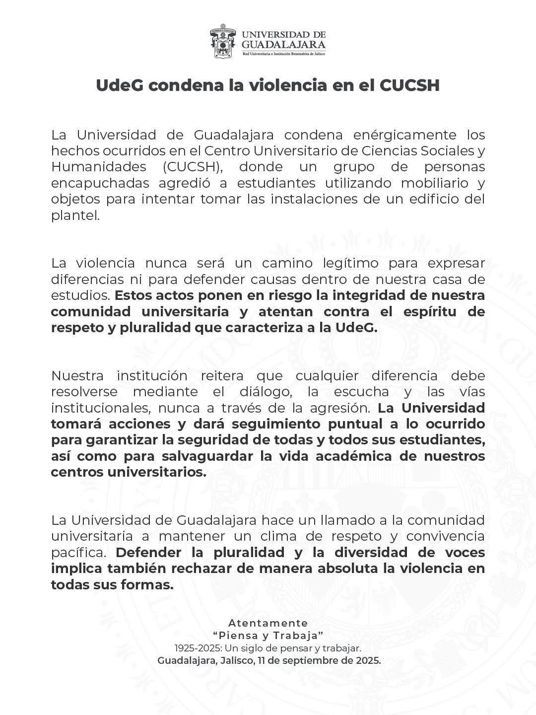 La casa de estudios aseguró que estos actos ponen en riesgo a toda la comunidad universitaria y afectan el ambiente de respeto y pluralidad que caracteriza a la institución. A través de su comunicado, la UdeG hizo un llamado a mantener un clima de convivencia pacífica.