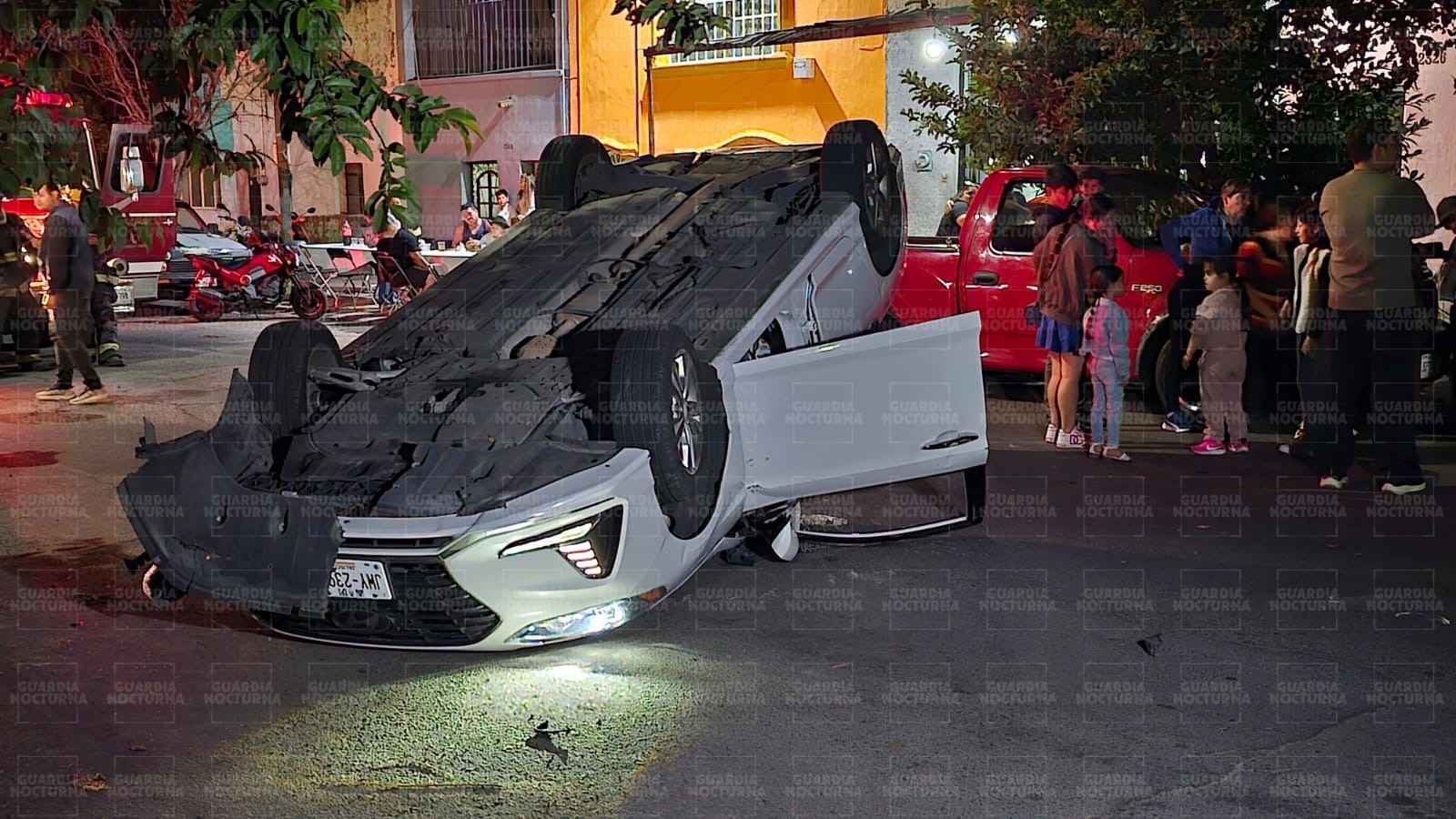 El impacto fue tan fuerte que provocó que el Hyundai Accent diera un giro y terminara volcado, con las llantas hacia arriba. A pesar de lo aparatoso del siniestro, los dos ocupantes del vehículo, un conductor y su copiloto, ambos de 19 años de edad, salieron del auto milagrosamente ilesos, sin requerir traslado a ningún puesto de socorro.