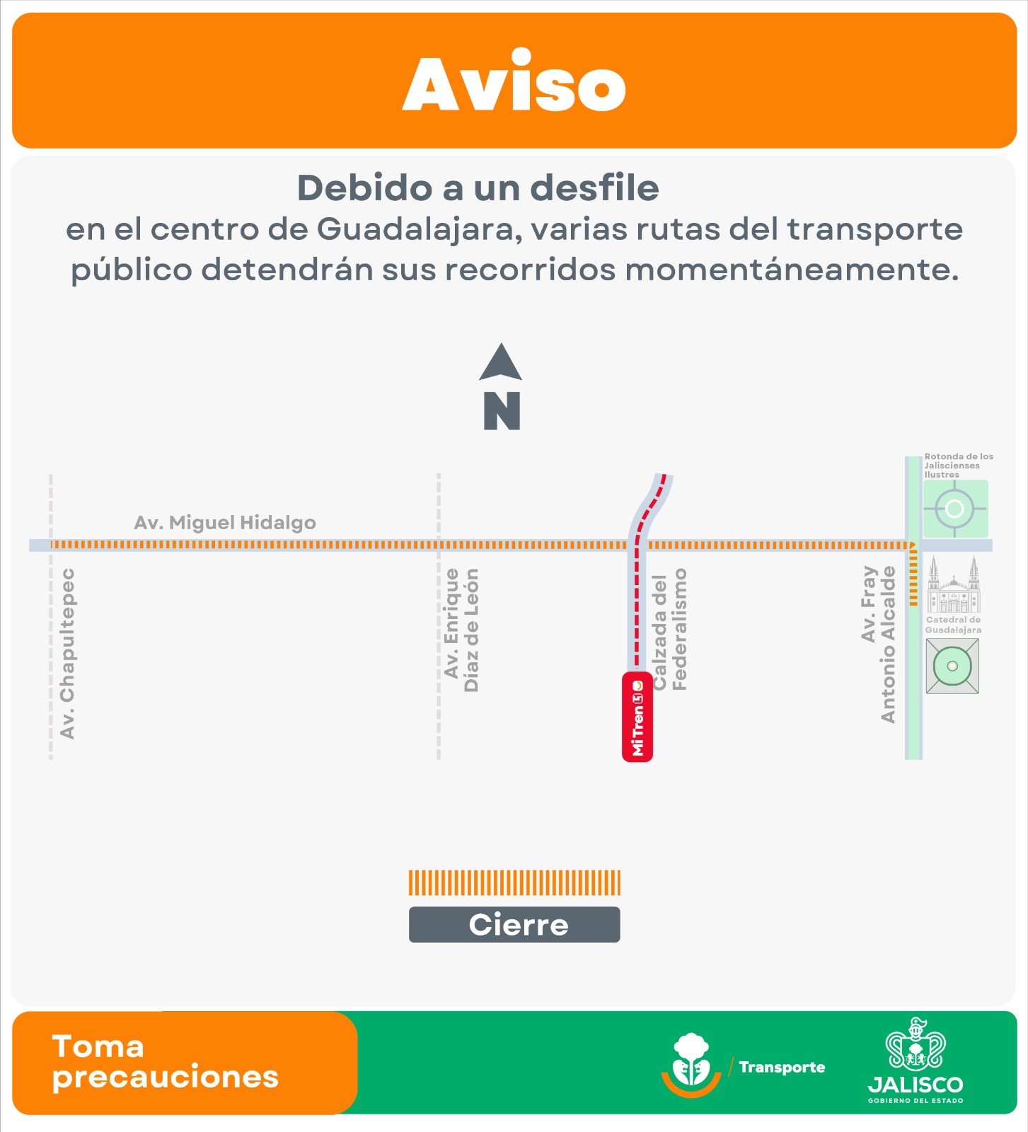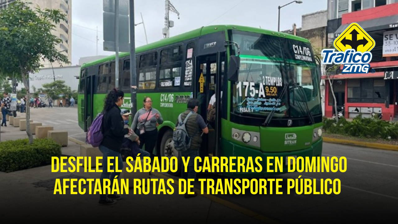 La Secretaría de Transporte (SETRAN) informa que este sábado 25 y domingo 26 de octubre se implementarán ajustes temporales en el servicio de transporte público en los municipios de Guadalajara y Zapopan, debido a un desfile y dos carreras deportivas.