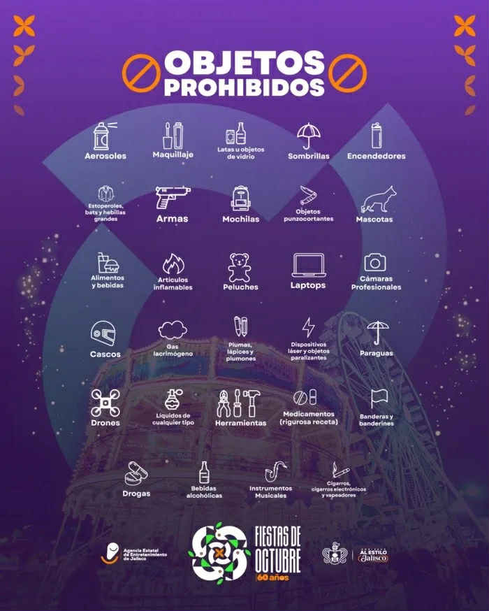 Las Fiestas de Octubre 2025 ya comenzaron en Guadalajara, ofreciendo música, gastronomía y espectáculos para toda la familia. Sin embargo, las autoridades del recinto han recordado a los asistentes la lista de objetos con los que no está permitido ingresar, con el fin de garantizar la seguridad y el orden durante el evento, que permanecerá abierto hasta el 4 de noviembre de 2025.