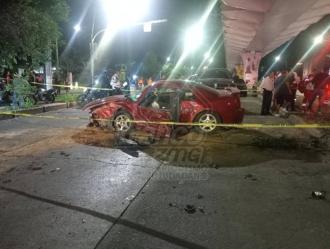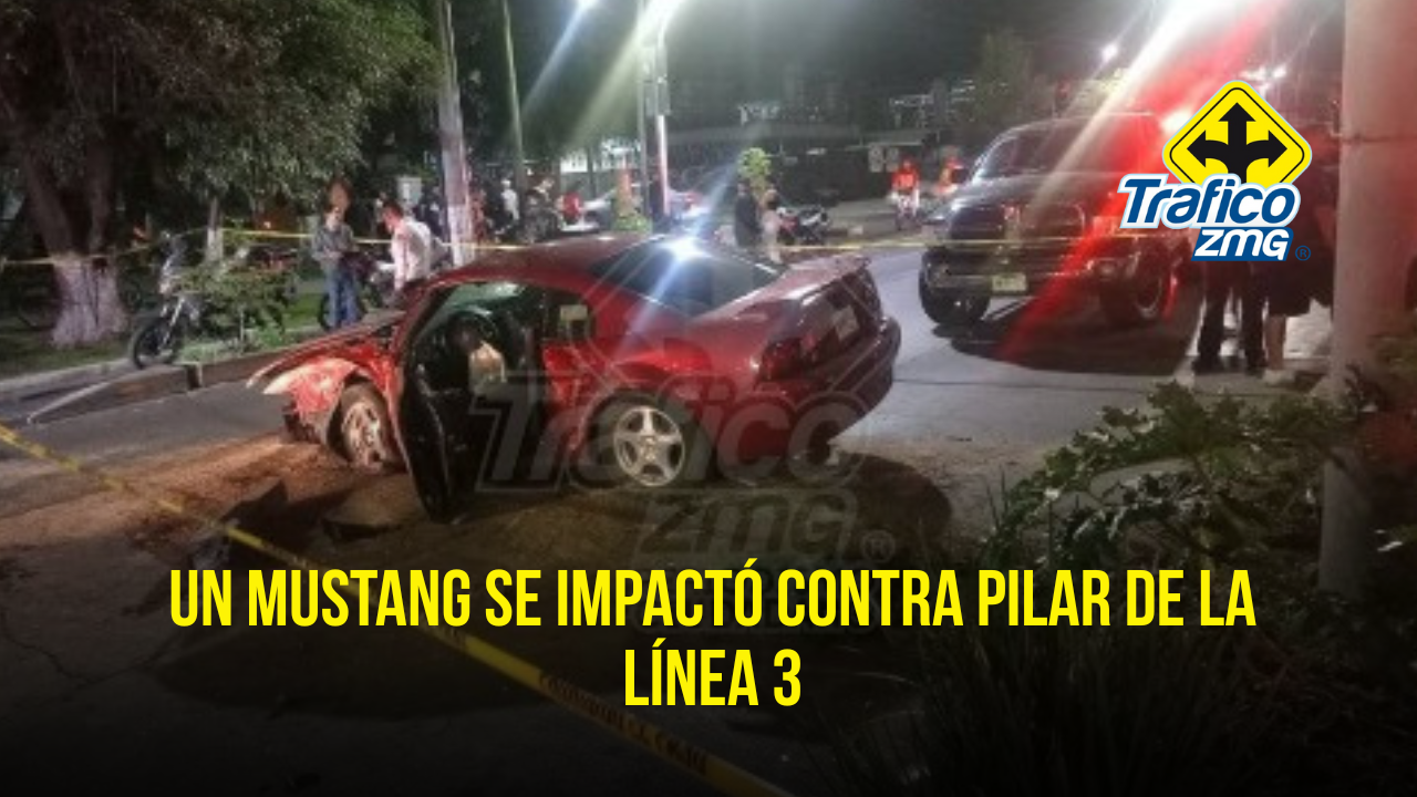 El percance involucró a un automóvil Mustang color rojo que se impactó contra uno de los pilares de la Línea 3 del Tren Ligero.