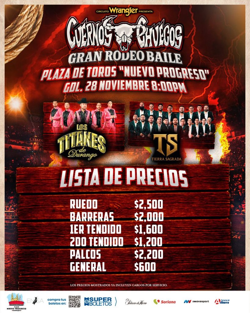 El espectáculo promete una noche llena de energía, montas extremas, luces, y un ambiente completamente vaquero que encenderá la capital jalisciense. El evento combina el tradicional rodeo de la empresa Cuernos Chuecos, reconocida por sus impresionantes jinetes y toros de élite, con presentaciones musicales en vivo de Los Titanes de Durango y Banda Tierra Sagrada, dos de las agrupaciones más queridas del género regional.