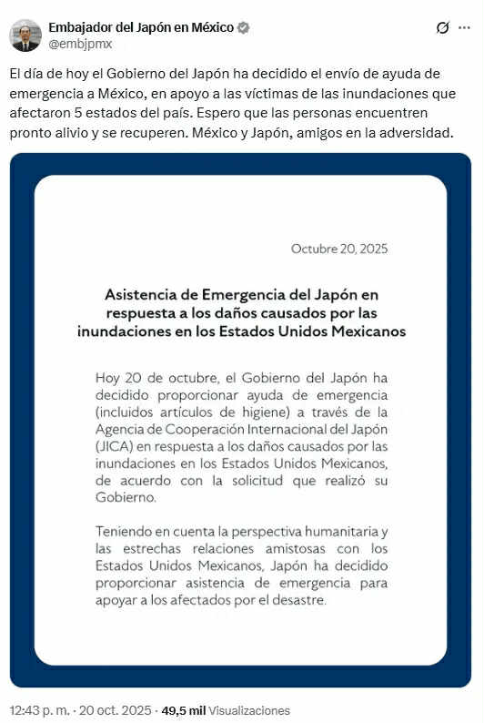 El embajador Honsei también expresó un mensaje de solidaridad a través de sus redes sociales, donde envió sus “deseos de pronta recuperación y ánimo” a las familias damnificadas en los estados de Veracruz, Hidalgo, Puebla, San Luis Potosí y Querétaro. “El pueblo japonés siempre cerca de México”, concluyó su mensaje.