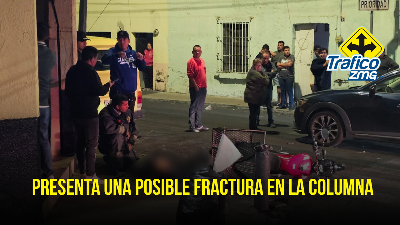Un hombre de aproximadamente 30 años de edad, presunto repartidor, resultó con lesiones graves y una posible fractura de columna tras ser impactado por un vehículo en la colonia Artesanos de Guadalajara, en el cruce de las calles Jesús García y Gregorio Dávila.