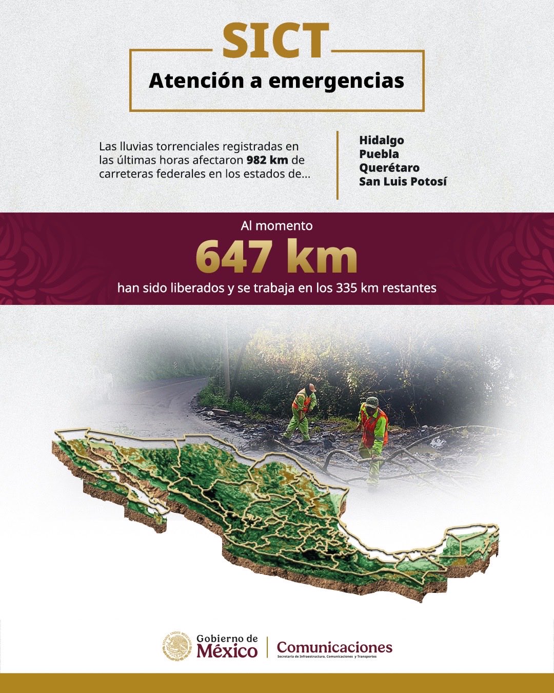 De acuerdo con la Secretaría de Infraestructura, Comunicaciones y Transportes (SICT), se han liberado 647 kilómetros, mientras que los 335 restantes continúan en reparación. En total, se registraron 108 interrupciones viales, de las cuales 93 ya fueron atendidas y 15 permanecen en proceso de rehabilitación.