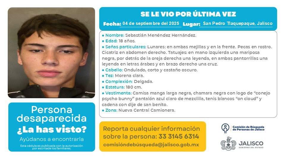Sebastián Menéndez Hernández, de 18 años, llegó desde Querétaro a Guadalajara con la intención de asistir a una supuesta entrevista de trabajo, pero desde el 4 de septiembre no se sabe nada de él. Su último rastro se ubicó en la Nueva Central Camionera, según informó su madre a Tráfico ZMG Periodismo Ciudadano, quien se percató de la desaparición a través de las ubicaciones compartidas entre ambos.