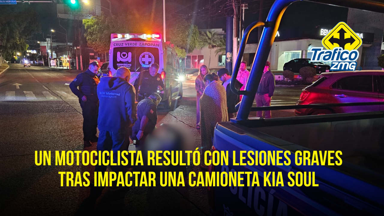 Un fuerte accidente de tránsito se registró en el cruce de las avenidas Patria y Pablo Neruda, en la colonia Universitaria de Zapopan, dejando como saldo a un motociclista con lesiones graves.