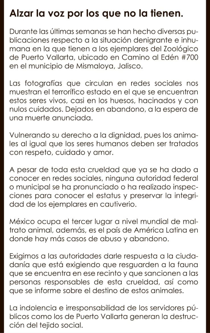 En Puerto Vallarta, Jalisco, activistas y asociaciones de bienestar animal han denunciado el presunto maltrato y abandono de los animales al interior del Zoológico de Puerto Vallarta, ubicado en Camino al Edén número 700, en la colonia Mismaloya. Los cuestionamientos surgieron a partir de fotografías y videos que circulan en redes sociales, donde se observa a ejemplares visiblemente desnutridos, jaulas oxidadas y condiciones de higiene que generan alarma.