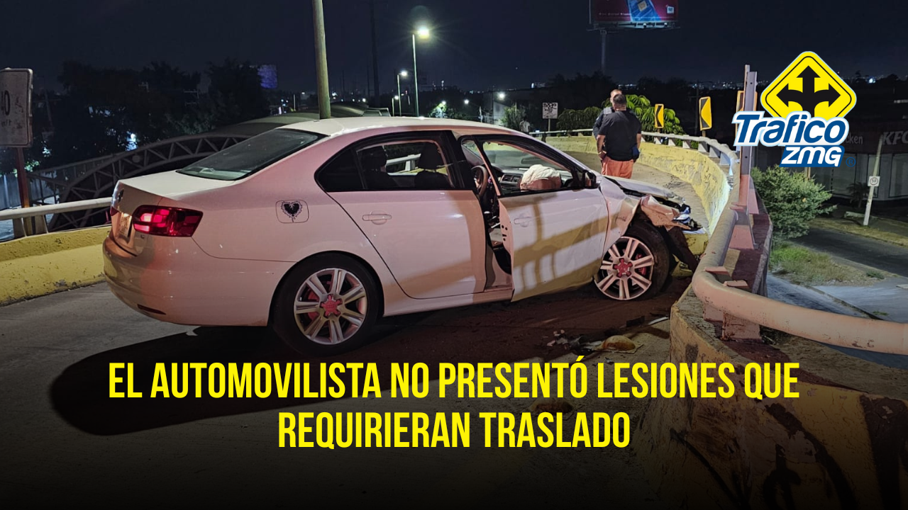 Un fuerte percance vial se registró sobre el paso a desnivel elevado ubicado en el cruce de las avenidas Patria y Colón, en la colonia López Portillo de Guadalajara. Un conductor, a bordo de un vehículo Volkswagen Jetta, se impactó de lleno contra el muro de contención.