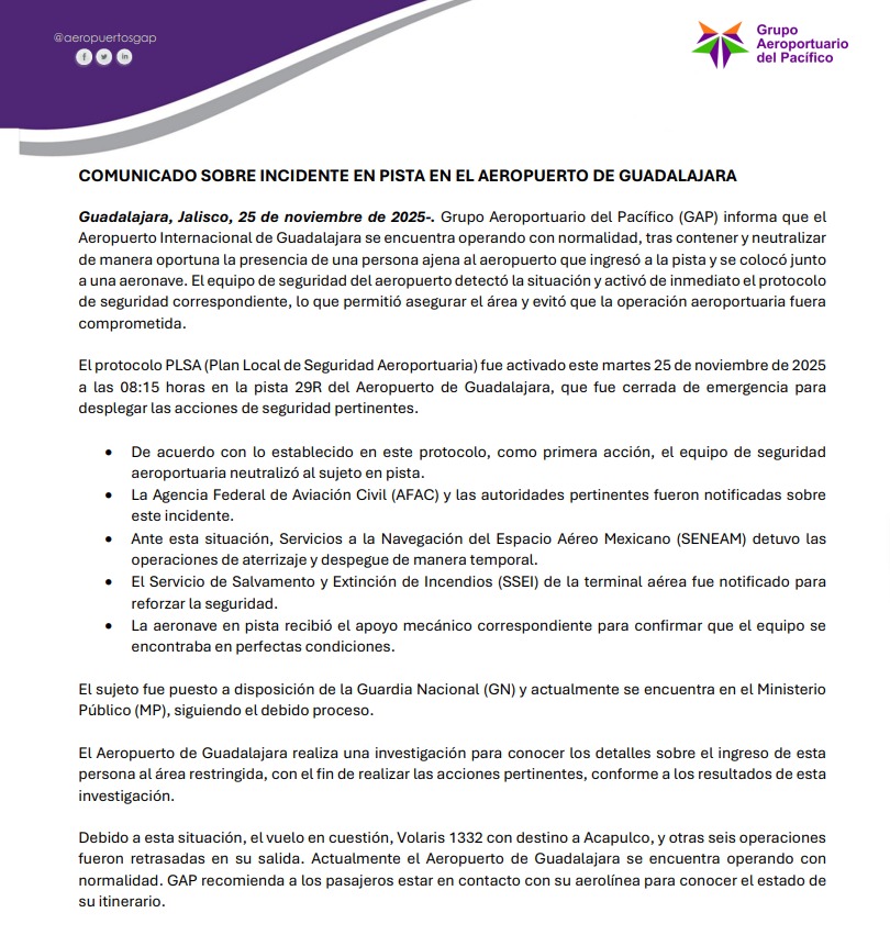 El Grupo Aeroportuario del Pacífico (GAP) informó que el equipo de seguridad detectó la presencia del individuo y activó de inmediato el Plan Local de Seguridad Aeroportuaria (PLSA), lo que permitió contener la situación sin poner en riesgo a pasajeros ni a las operaciones programadas.