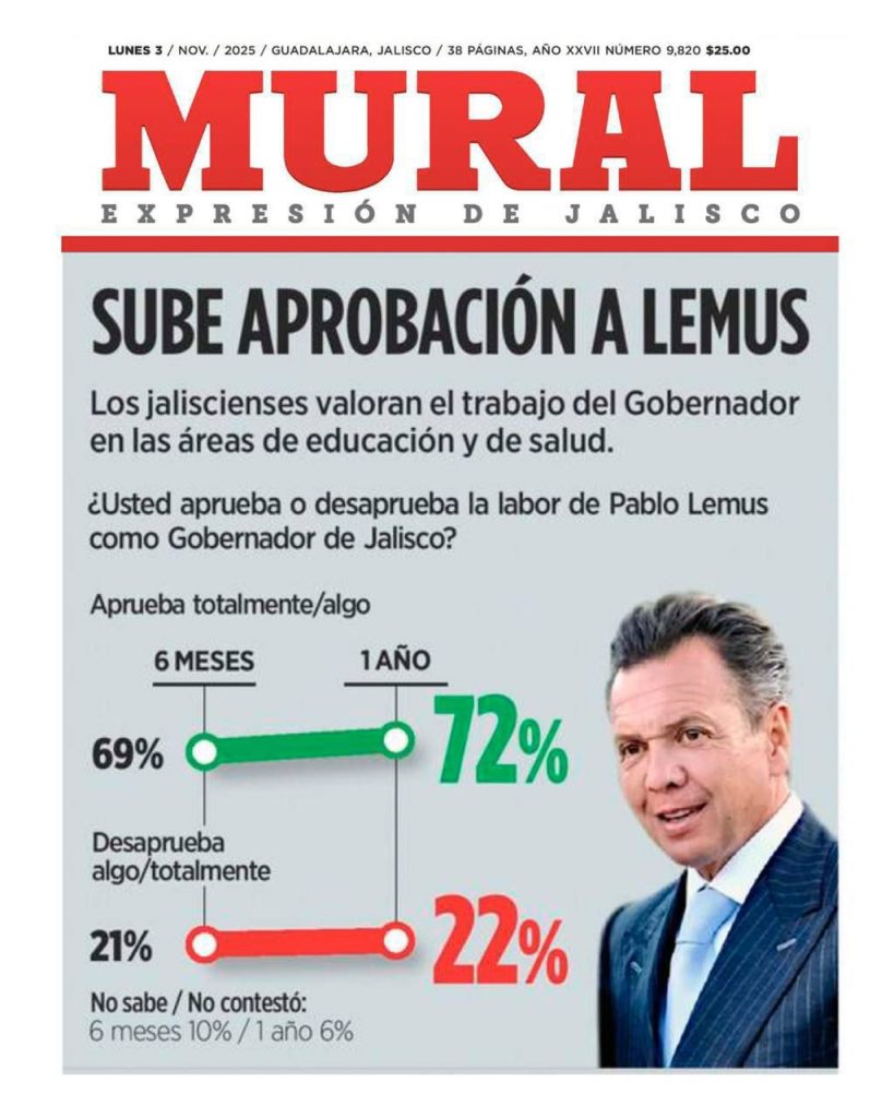 La aprobación del gobernador de Jalisco, Pablo Lemus Navarro, registró un aumento, de acuerdo con una encuesta publicada por Grupo Reforma y difundida por el diario Mural.