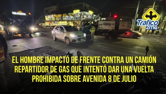 Una vez más la imprudencia al conducir sería la causa de un aparatoso percance vial, la tarde de este lunes, el conductor de una motocicleta se impactó de frente contra un camión repartidor de la empresa Z gas, mismo que a decir de testigos, habría intentado dar una vuelta prohibida, incluso con la luz roja de semáforo. Esto sobre el cruce de la avenida 8 de Julio y la calle 1, en la zona industrial de Guadalajara.
