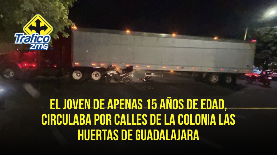 Un aparatoso percance vial se vivió la noche de este viernes sobre el cruce de las calles José María Gómez y Josefa Ortiz de Domínguez, en la colonia Las Huertas de Guadalajara. Todo se derivó luego de que un joven de tan solo 15 años de edad, que circulaba a bordo de su motocicleta de bajo cilindraje, fuera embestido por un tráiler.
