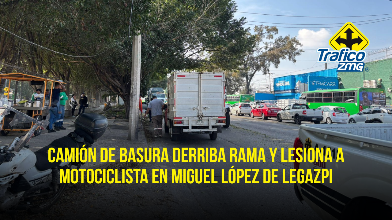 La mañana de este lunes, un camión recolector de basura derribó la rama de un árbol mientras circulaba sobre la avenida Miguel López de Legazpi, en su cruce con la avenida 8 de Julio, en la colonia Industrial de Guadalajara. La rama cayó directamente sobre un motociclista de aproximadamente 50 años de edad que pasaba por la zona al momento del incidente.