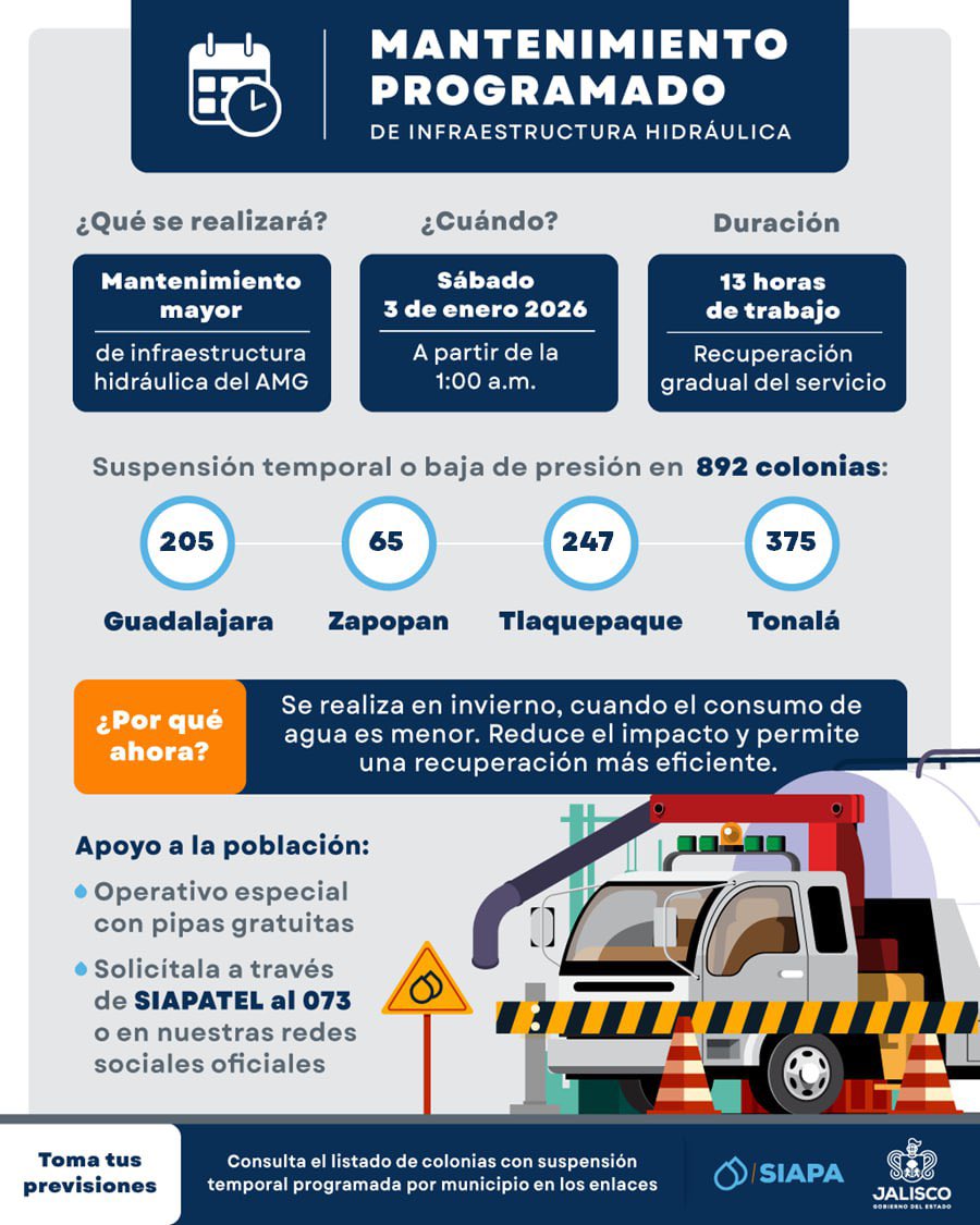 El Sistema Intermunicipal de los Servicios de Agua Potable y Alcantarillado (SIAPA) informó que realizará trabajos de mantenimiento preventivo a la infraestructura hidráulica de la Zona Metropolitana de Guadalajara (ZMG), los cuales comenzarán el sábado 3 de enero de 2026 a partir de la 01:00 horas y tendrán una duración aproximada de 13 horas.