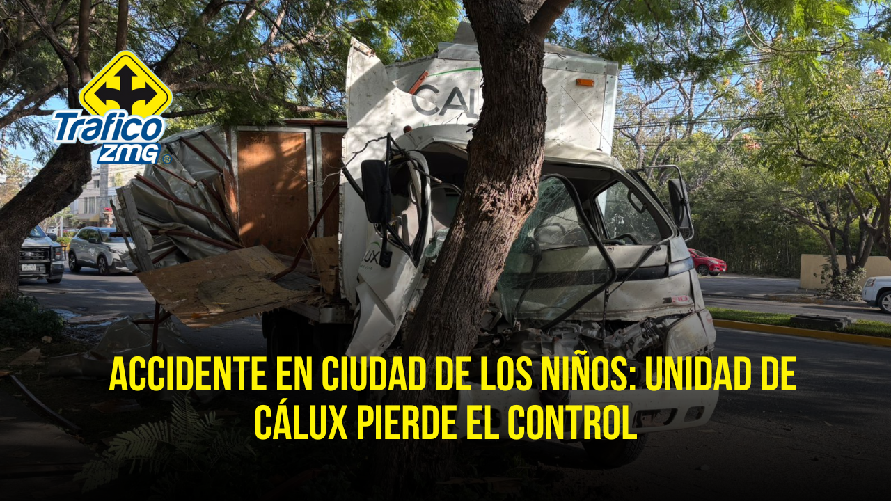 Un vehículo de la empresa Cálux terminó estrellado contra un árbol la mañana de este lunes sobre la avenida Niño Obrero, entre Parque Juan Diego y avenida Tepeyac, en la colonia Ciudad de los Niños, en Zapopan.