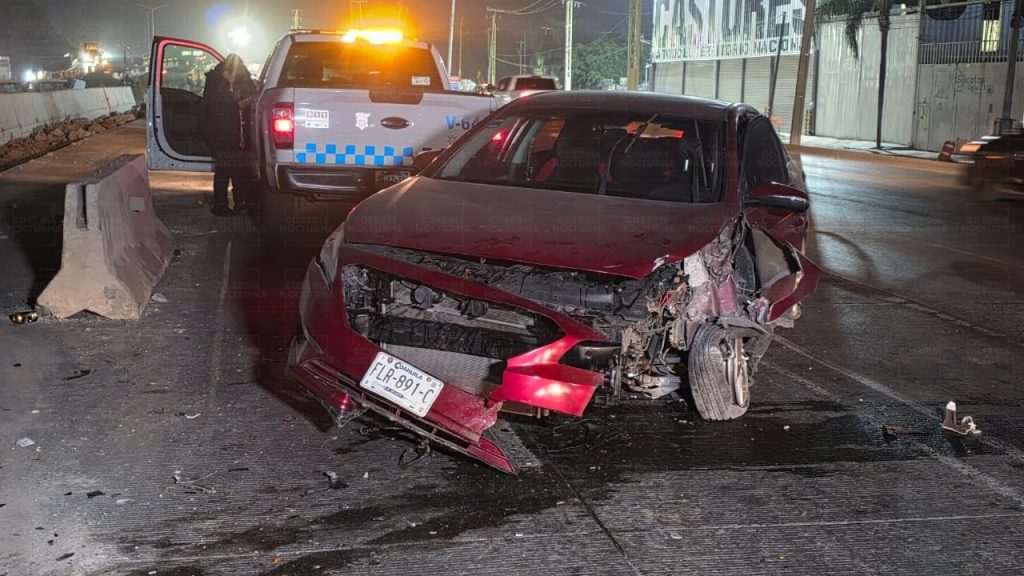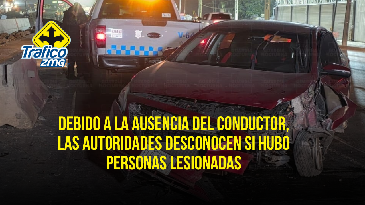 Un aparatoso accidente vial se registró sobre el Periférico, casi en su cruce con la Carretera a Chapala, donde el conductor de un Hyundai Elantra se impactó contra bloques de concreto colocados por obras en la zona. El fuerte choque provocó que el vehículo diera un giro, quedando orientado prácticamente en sentido contrario.