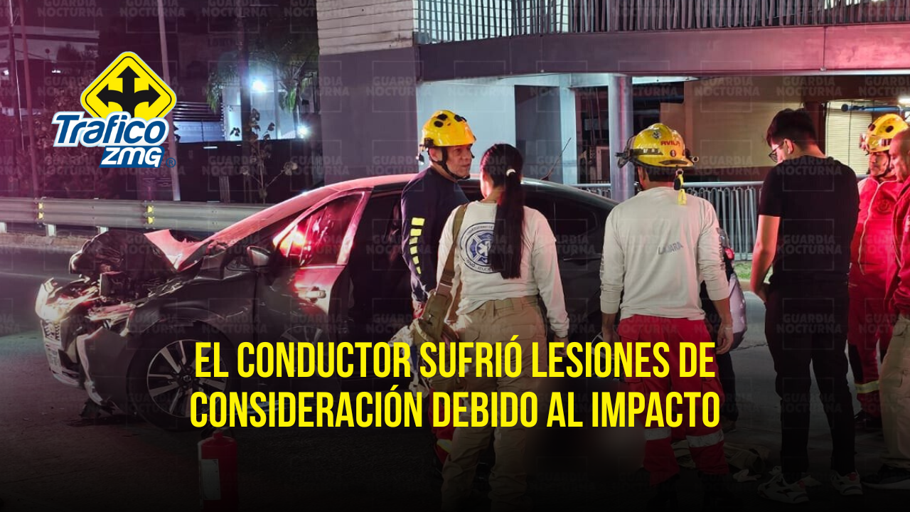 La madrugada del lunes, un aparatoso accidente automovilístico se registró en el carril de Mi Macro Periférico, a la altura de la estación Zoológico Guadalajara, cuando un conductor perdió el control de su vehículo. El hombre, de entre 30 a 35 años de edad, al parecer alcoholizado, invadió los topes divisorios del carril confinado, lo que provocó que el auto saliera proyectado.