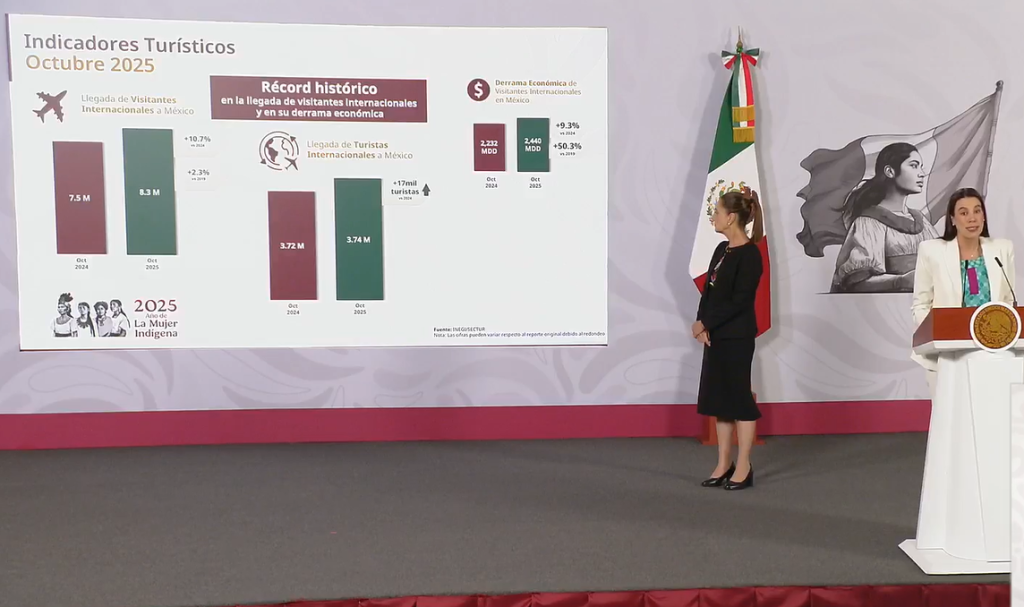 De acuerdo con la secretaria de Turismo, Josefina Rodríguez, el turismo interno —responsable del 80% del movimiento turístico en el país— también mostró crecimiento. De enero a octubre, 3 millones más de mexicanos viajaron respecto al mismo periodo de 2024, lo que representa un incremento de 3.3 por ciento, alcanzando un total de 92.6 millones de viajeros nacionales.