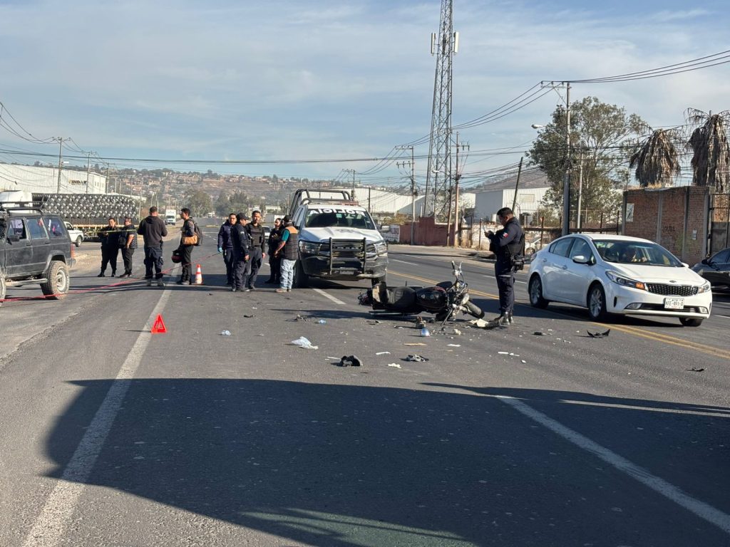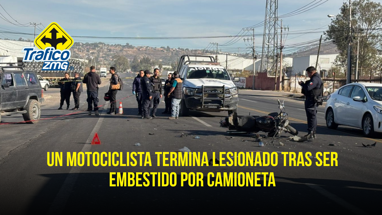 Un accidente se registró sobre la carretera San Martín–Al Verde, a la altura del parque industrial FINSA Jalisco, en San Pedro, Tlaquepaque, donde un motociclista resultó lesionado tras verse involucrado en un percance con una camioneta.