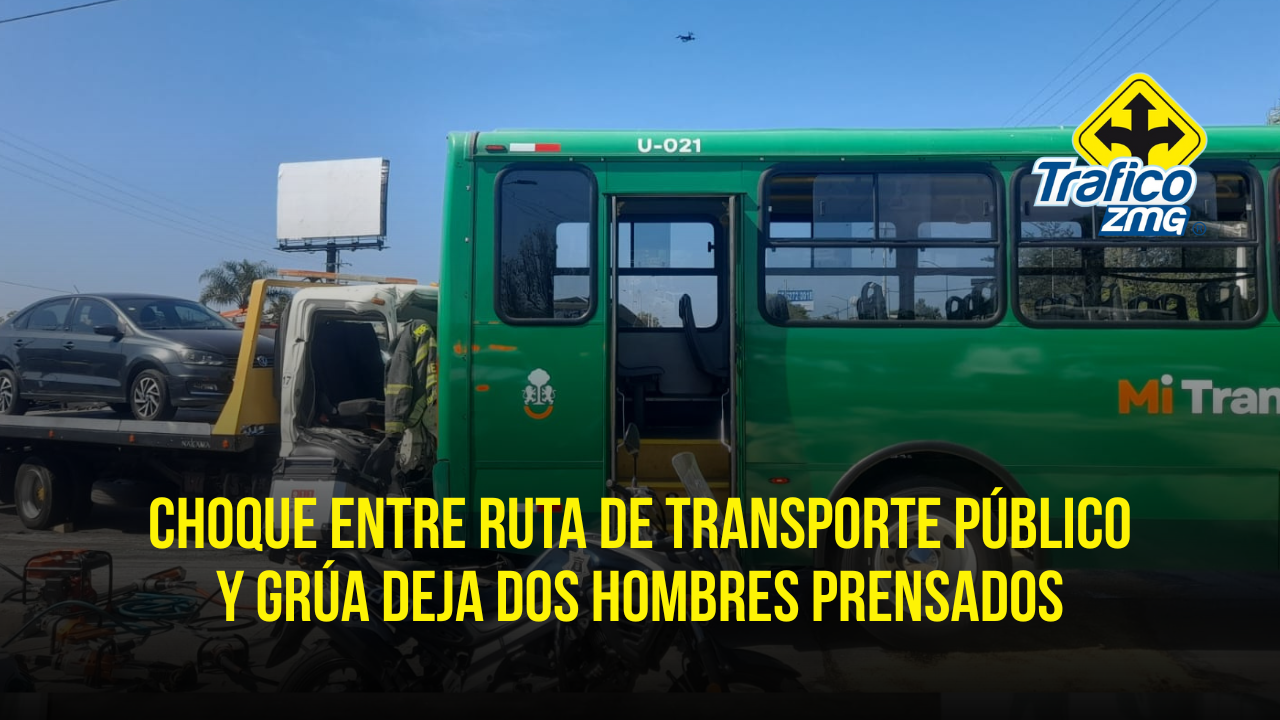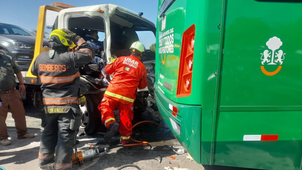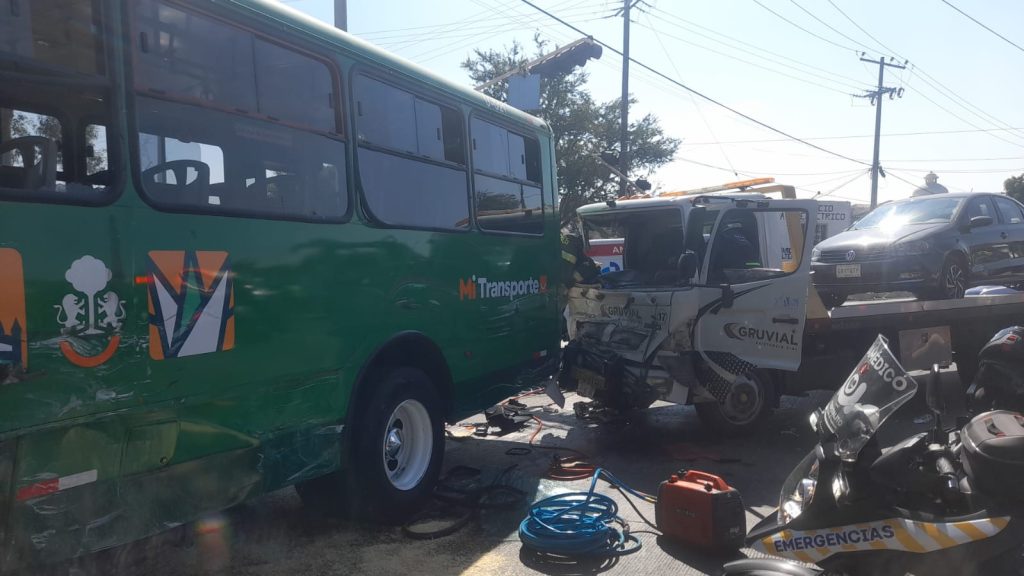 De acuerdo con los primeros reportes, la grúa impactó por alcance la parte trasera del camión urbano, lo que provocó que el conductor y el copiloto de la unidad pesada quedaran prensados de las piernas dentro de la cabina.