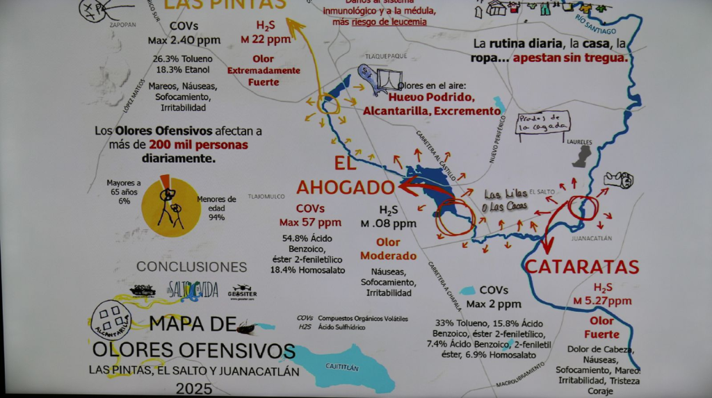 Durante la presentación, el doctor Jaime Torres Guillén explicó que el trabajo se realizó con la participación de habitantes y personas externas a la zona, además de mediciones para identificar las sustancias presentes en el aire. Las muestras se tomaron en lugares como las presas de Las Pintas y El Ahogado, así como en las cataratas del río Santiago.