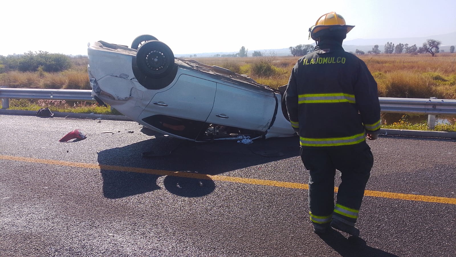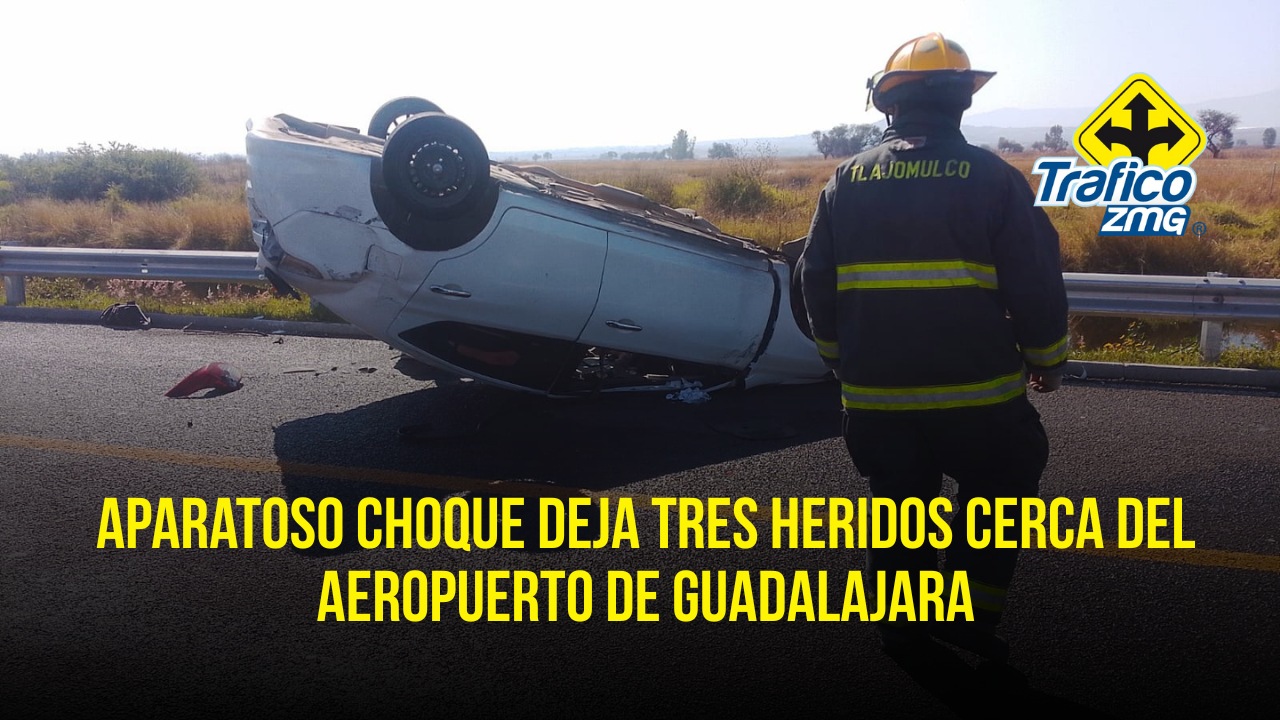 Tras un fuerte choque, uno de los vehículos involucrados volcó sobre carretera a El Zapote a la altura de la Nueva Aviación General del Aeropuerto de Guadalajara.